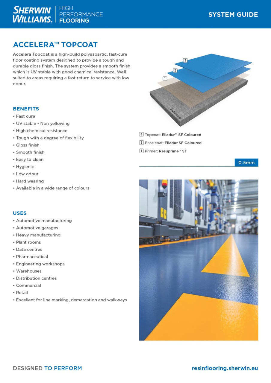 Accelera Topcoat is a high-build polyaspartic, fast-cure floor coating system designed to provide a tough and durable gloss finish. The system provides a smooth finish which is UV stable with good chemical resistance. Well suited to areas requiring a fast return to service with low odour.