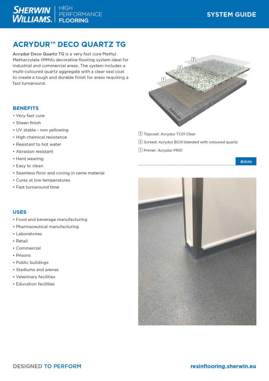 Acrydur Deco Quartz TG is a very fast cure Methyl Methacrylate (MMA) decorative flooring system ideal for industrial and commercial areas. The system includes a multi-coloured quartz aggregate with a clear seal coat to create a tough and durable finish for areas requiring a fast turnaround.