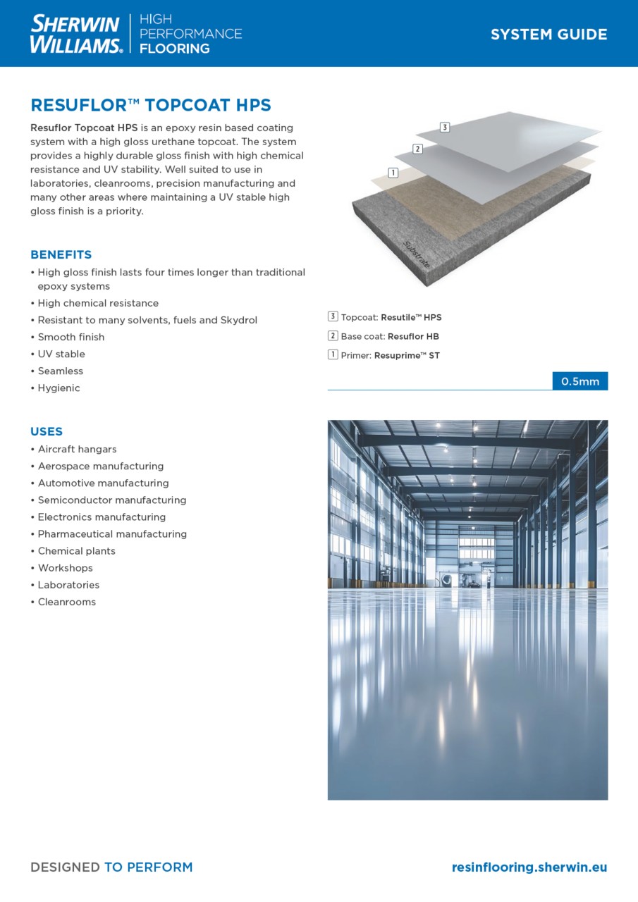 Resuflor Topcoat HPS is an epoxy resin based coating system with a high gloss urethane topcoat. The system provides a highly durable gloss finish with high chemical resistance and UV stability. Well suited to use in laboratories, cleanrooms, precision manufacturing and many other areas where maintaining a UV stable high gloss finish is a priority.