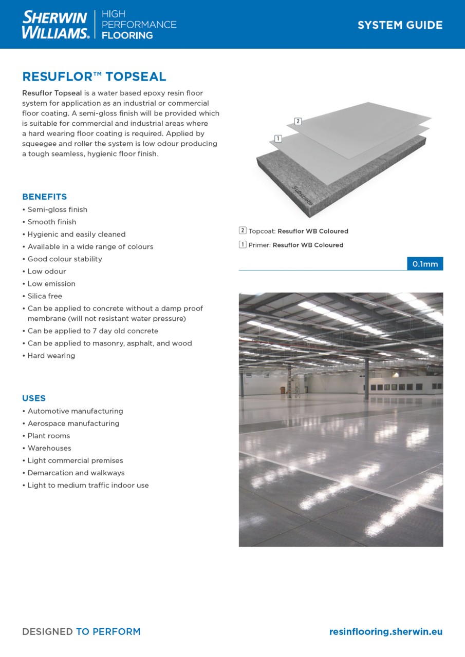Resuflor Topseal is a water based epoxy resin floor system for application as an industrial or commercial floor coating. A semi-gloss finish will be provided which is suitable for commercial and industrial areas where a hard wearing floor coating is required. Applied by squeegee and roller the system is low odour producing a tough seamless, hygienic floor finish.