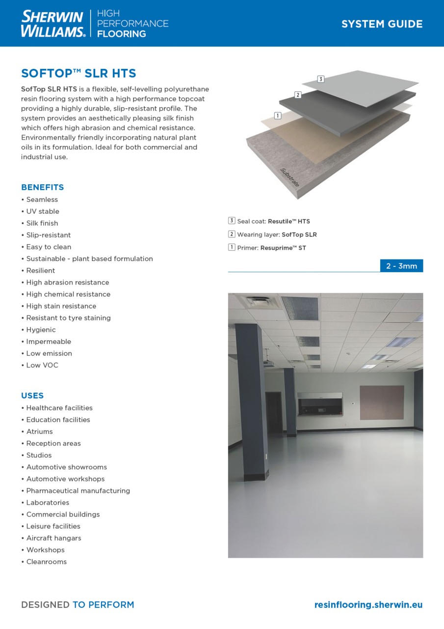 SofTop SLR HTS is a flexible, self-levelling polyurethane resin flooring system with a high performance topcoat providing a highly durable, slip-resistant profile. The system provides an aesthetically pleasing silk finish which offers high abrasion and chemical resistance. Environmentally friendly incorporating natural plant oils in its formulation. Ideal for both commercial and industrial use.