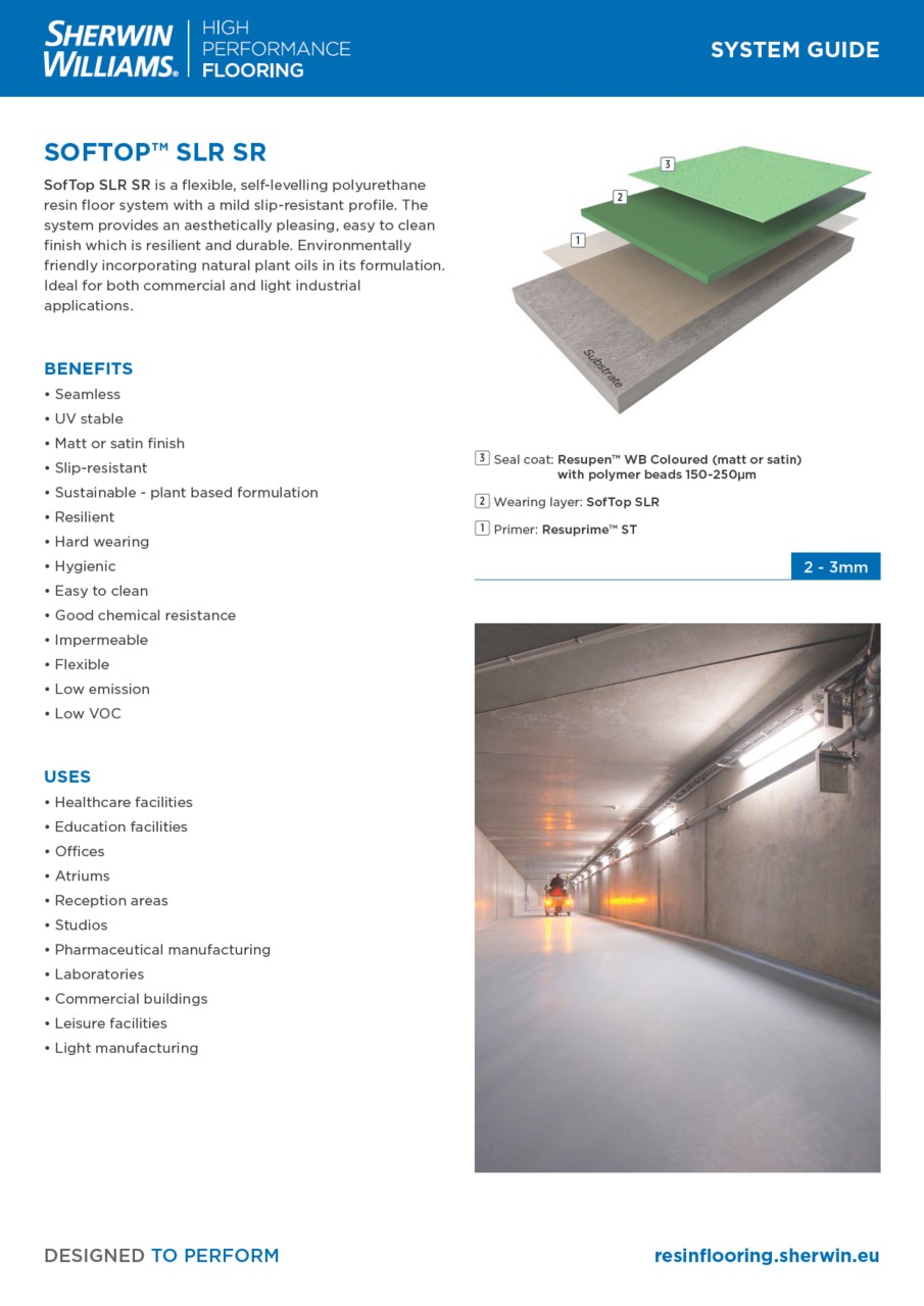 SofTop SLR SR is a flexible, self-levelling polyurethane resin floor system with a mild slip-resistant profile. The system provides an aesthetically pleasing, easy to clean finish which is resilient and durable. Environmentally friendly incorporating natural plant oils in its formulation. Ideal for both commercial and light industrial applications.
