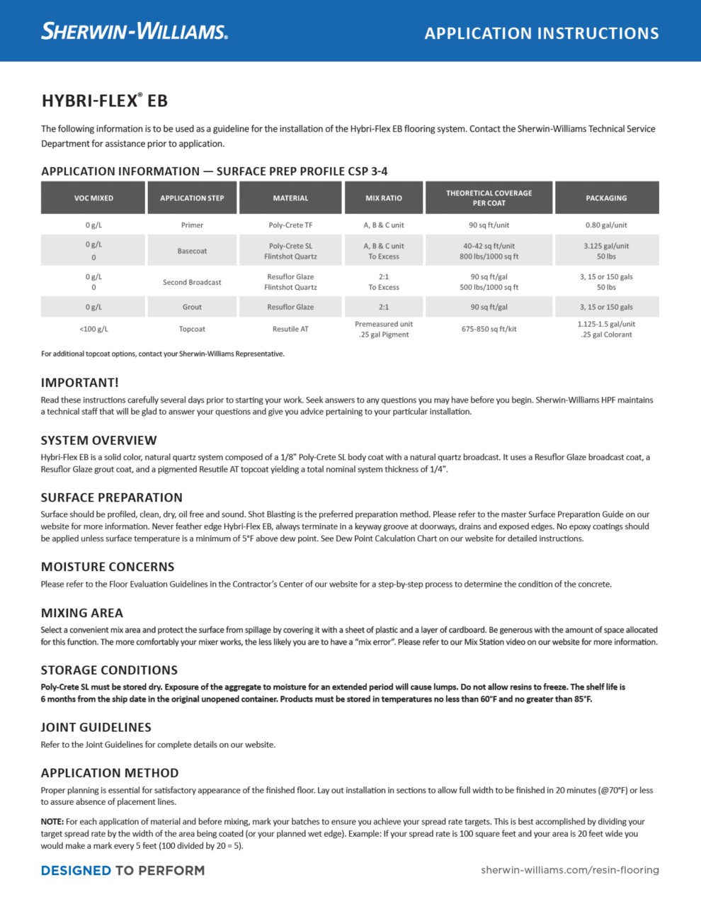 Hybri-Flex™ EB is a solid color, hybrid floor system consisting of our cementitious urethane base coat and epoxy and urethane topcoats. Natural quartz aggregate is incorporated for improved slip resistance. The nominal system thickness is 3/16 inch (flintshot). It is an ideal choice for installation on freshly placed concrete, rough existing floors, or where higher impact resistance is desired.
