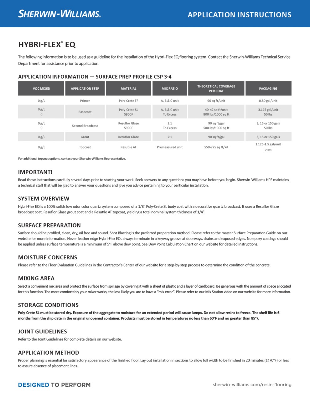 Hybri-Flex™ EQ is a seamless, nominal 3/16 - 1/4 inch decorative quartz floor system featuring a moisture tolerant self-priming and self-leveling body coat topped with a double broadcast of decorative quartz aggregate and finished with a Resutile™ AT topcoat for a chemical, UV, and wear-resistant urethane topcoat.