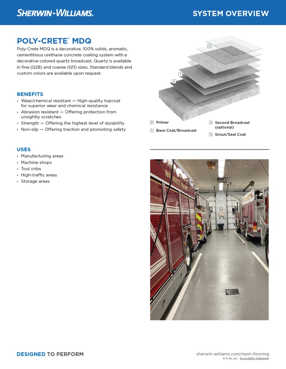 Poly-Crete™ MDQ is a decorative, 100% solids, aromatic, cementitious urethane concrete coating system with a decorative colored quartz broadcast. Quartz is available in fine (Q28) and coarse (Q11) sizes. Standard blends and custom colors are available upon request.