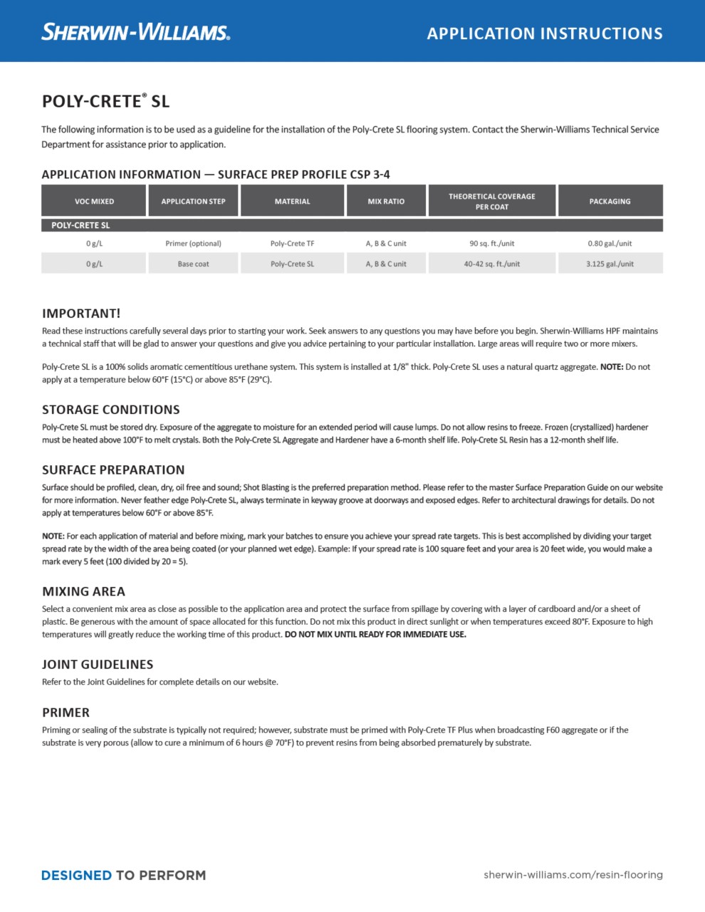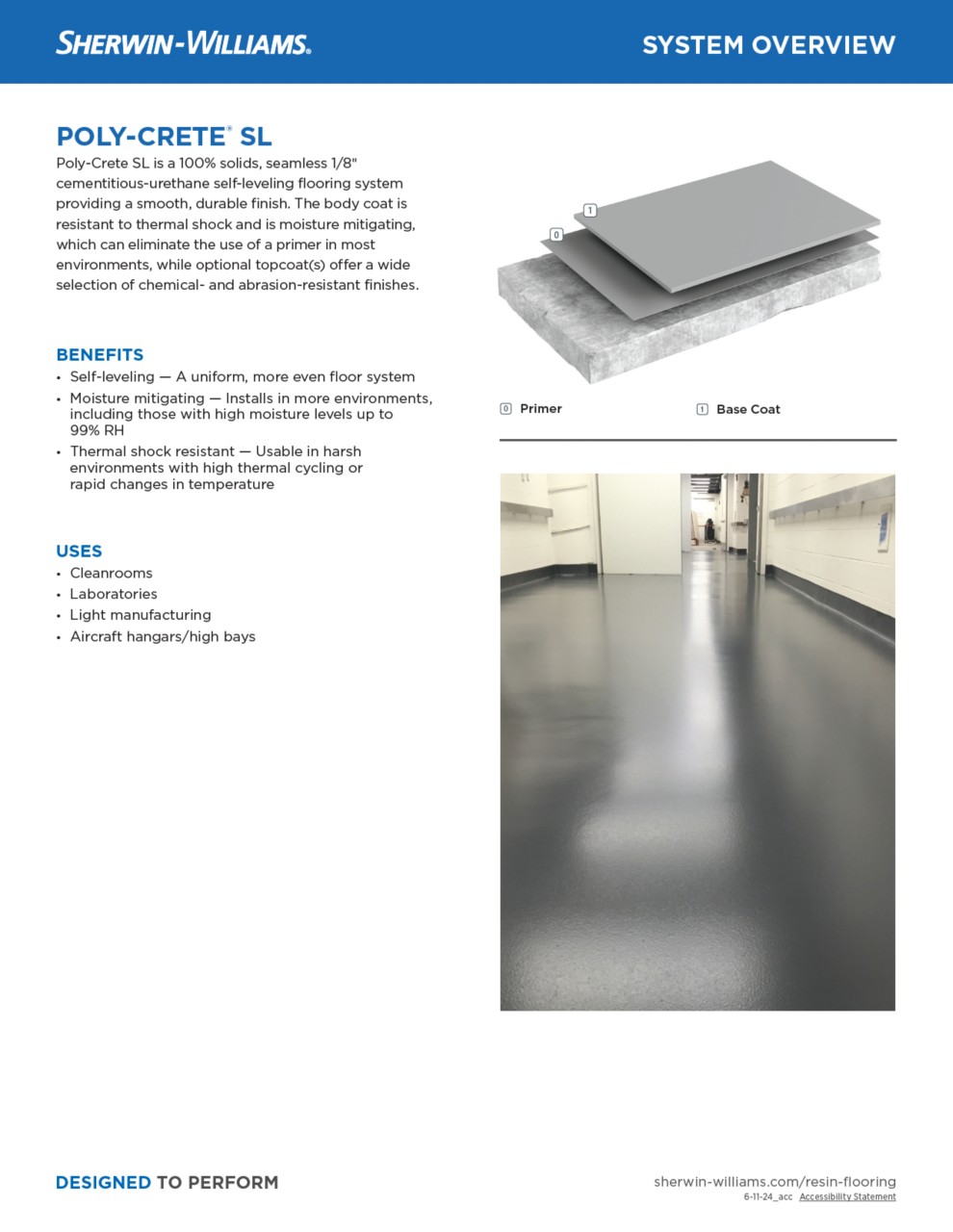 Poly-Crete™ SL is a 100% solids, aromatic, cementitious urethane system blended with graded silica and fine fillers applied at 1/8 inch to produce a self-leveling matte finish. In approved applications, Poly-Crete™ SL may be used as a moisture mitigating underlayment for resilient flooring products.