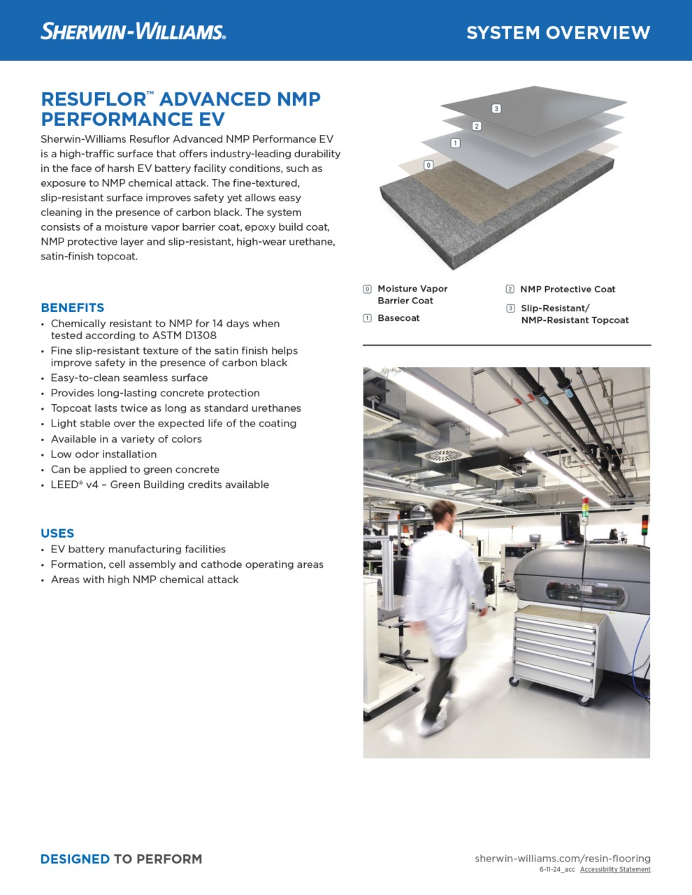This epoxy-based system with urethane topcoats allows for a fast installation. It can be applied to green concrete, reducing the required substrate cure time from 28 days to 7 days. It demonstrates N-Methyl-2-pyrrolidone (NMP) resistance of up to 14 days under glass when tested to ASTM D1308. It has a dynamic slip coefficient of .72 versus the .42 industry standard to ANSI A326.3 and abrasion resistance of ASTM 4060 which is 4-6 times greater than standard epoxy topcoats.