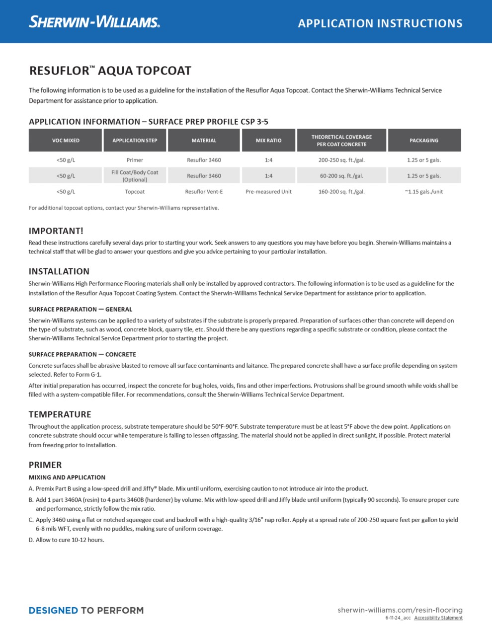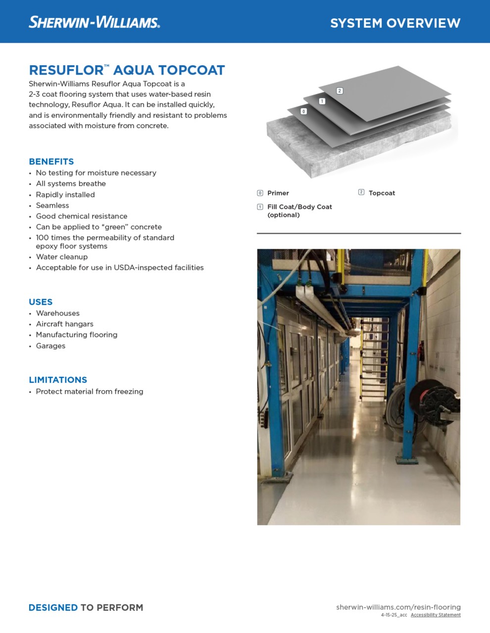 Resuflor™ Aqua Topcoat installs quickly, is sustainable and resistant to problems associated with moisture from the concrete. It features good chemical resistance and water cleanup and is acceptable for use in USDA inspected facilities.