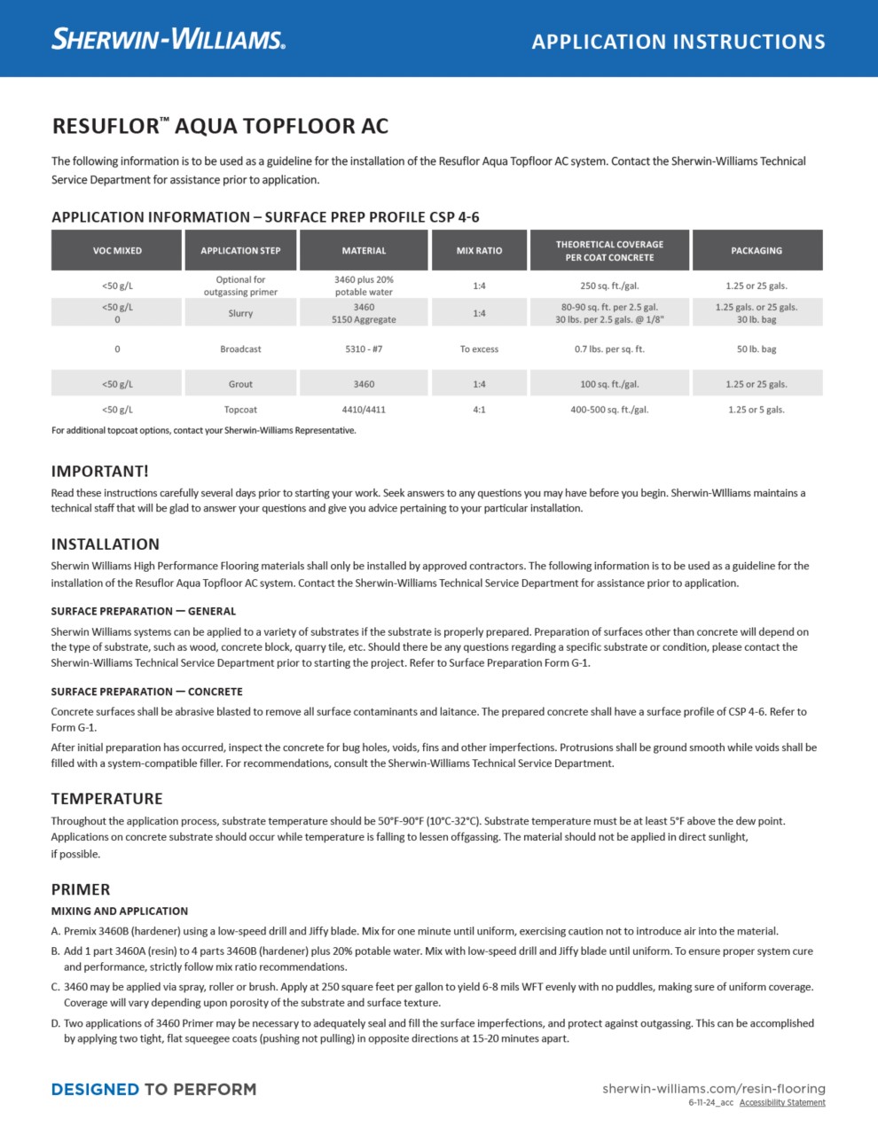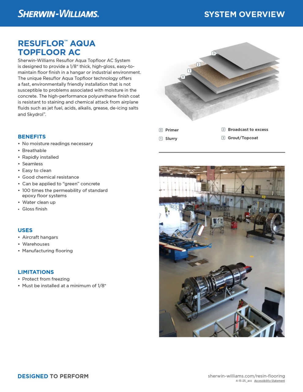 Resuflor Aqua Topfloor AC is designed to provide a 1/8-inch-thick, high-gloss, easy-to-maintain floor finish in a hangar or industrial environment. The high-performance polyurethane finish coat is resistant to staining and chemical attack from airplane fluids such as jet fuel, acids, alkalies, grease, de-icing salts, and Skydrol.