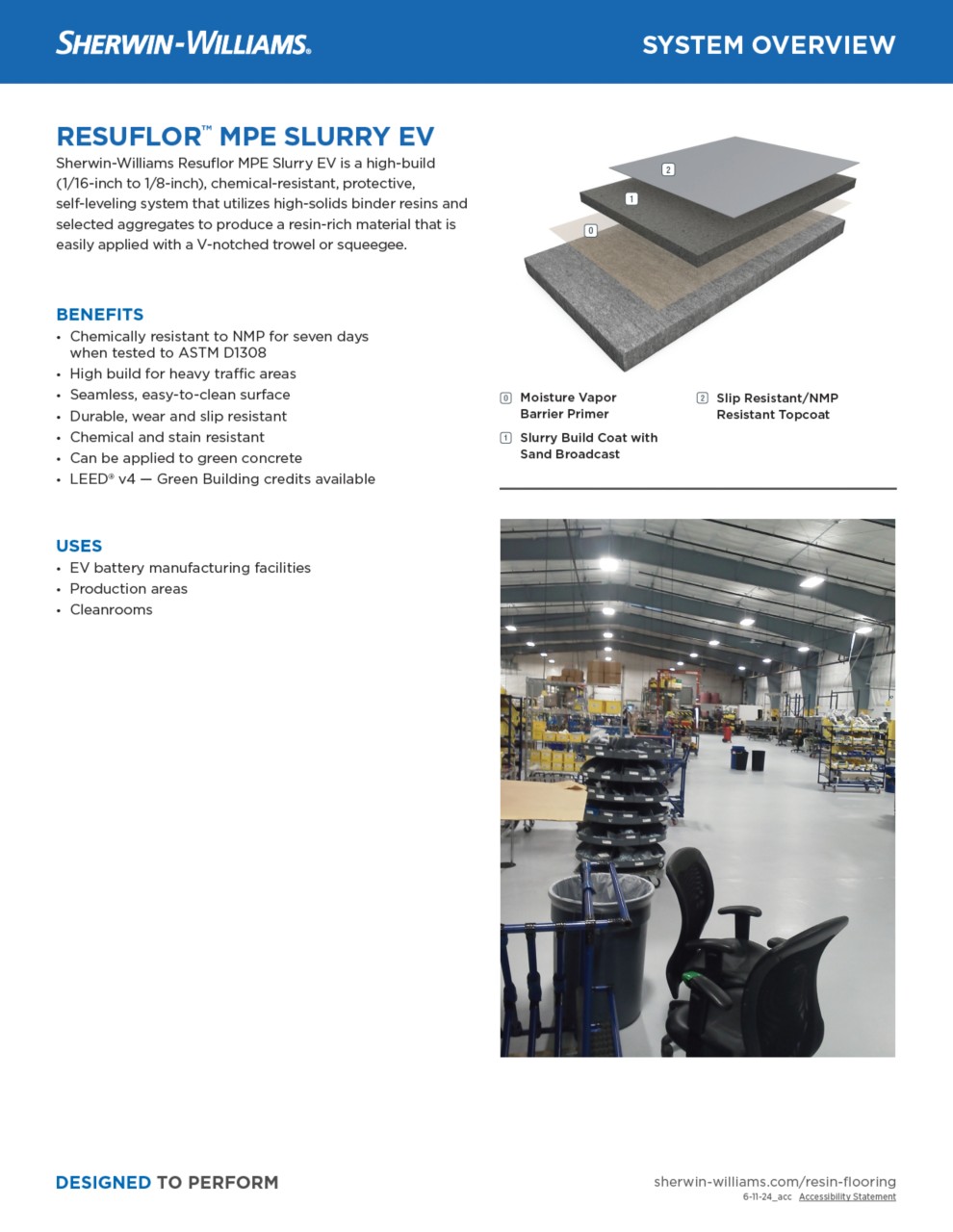 A seven day NMP-resistant, slurry flooring system, ideal for use in EV battery and other industrial manufacturing facilities.