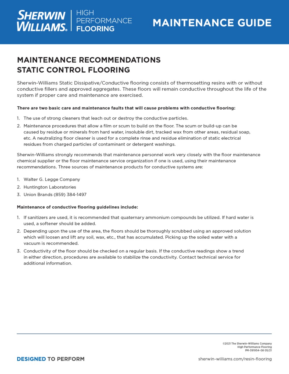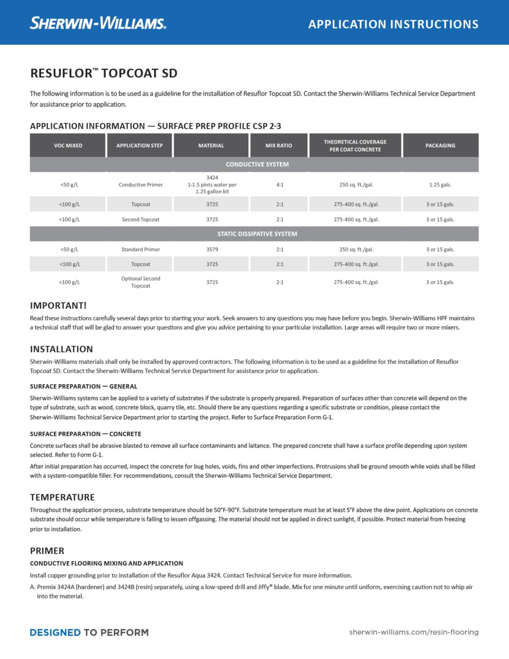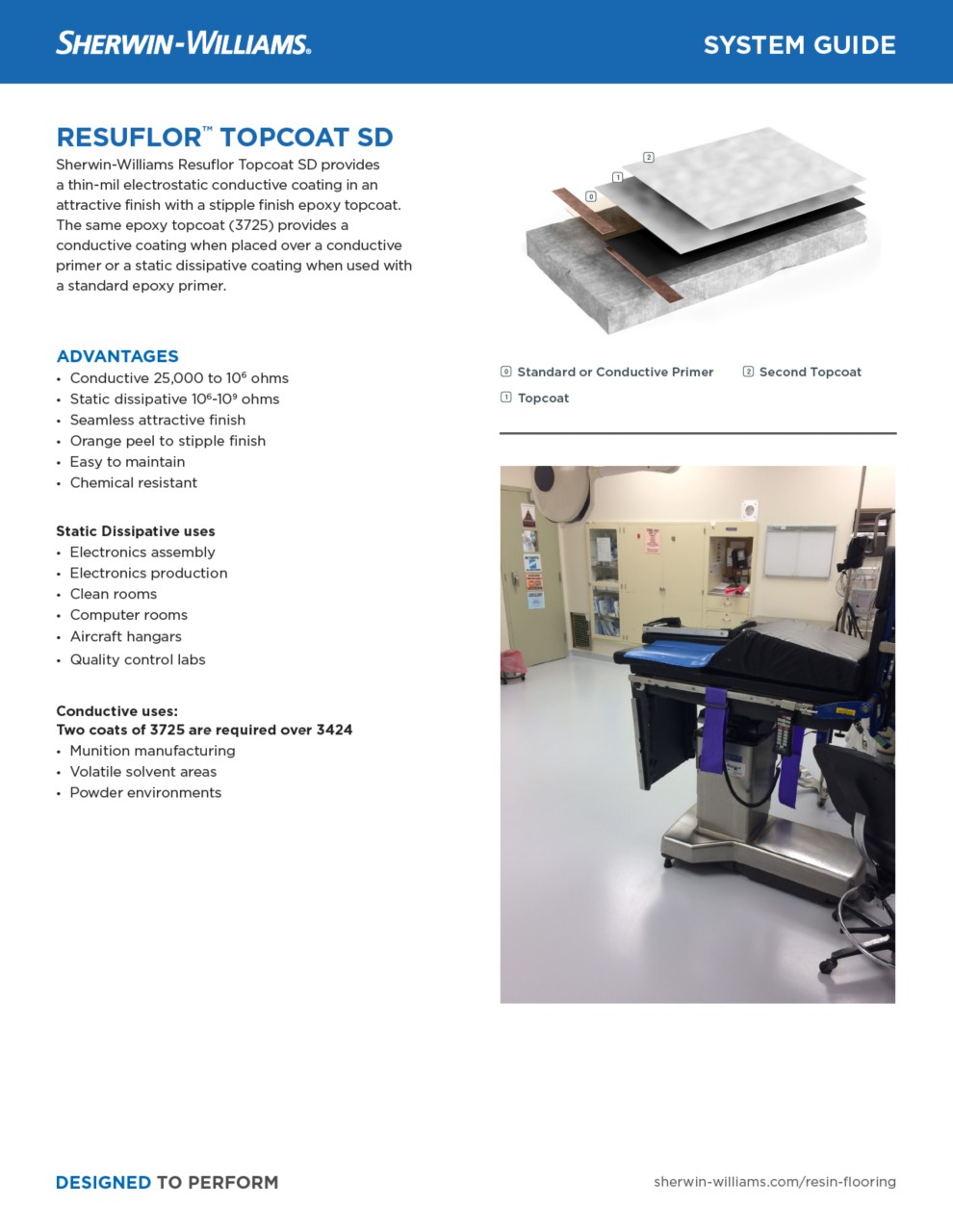 Resuflor Topcoat SD provides a thin-mil electrostatic conductive coating in an attractive finish with a stipple finish epoxy topcoat. The same epoxy topcoat provides a conductive coating when placed over a conductive primer or a static dissipative coating when used with a standard epoxy primer.