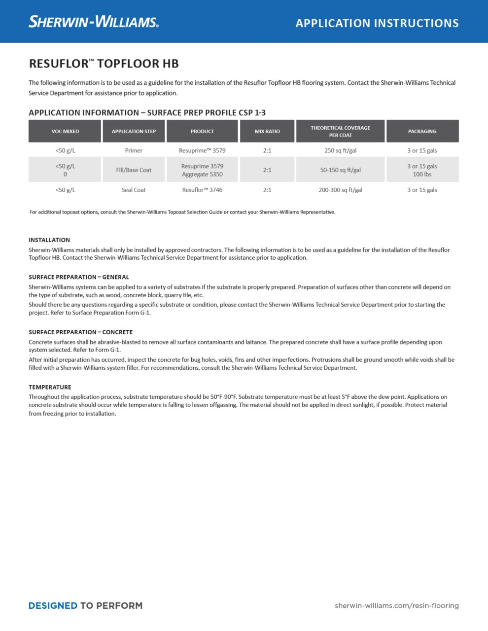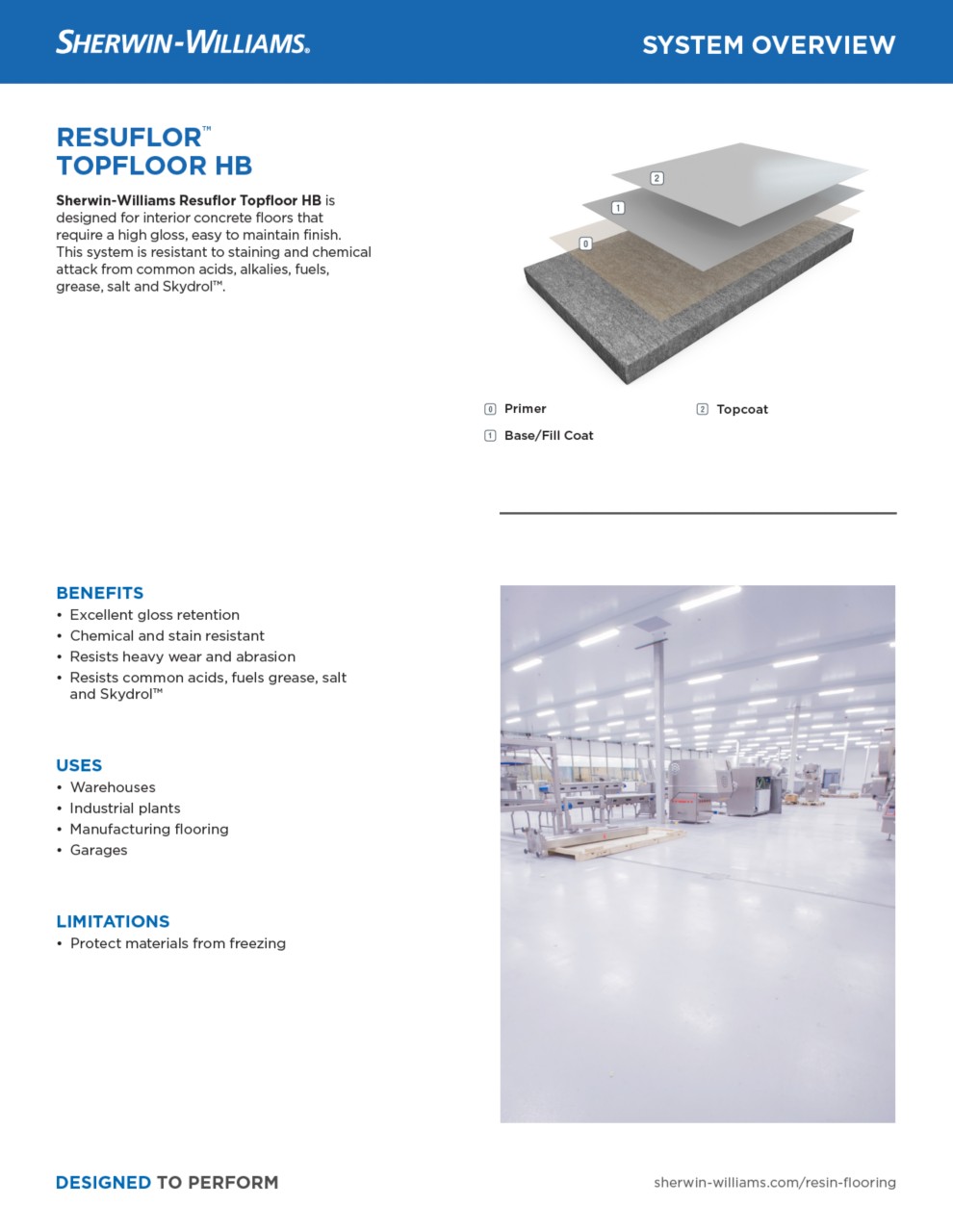 Resuflor™ Topfloor HB is designed for rough interior concrete floors that require a high gloss, easy-to-maintain finish. This system is resistant to staining and chemical attack from certain common acids, alkalies, fuels, grease, salt, and Skydrol.