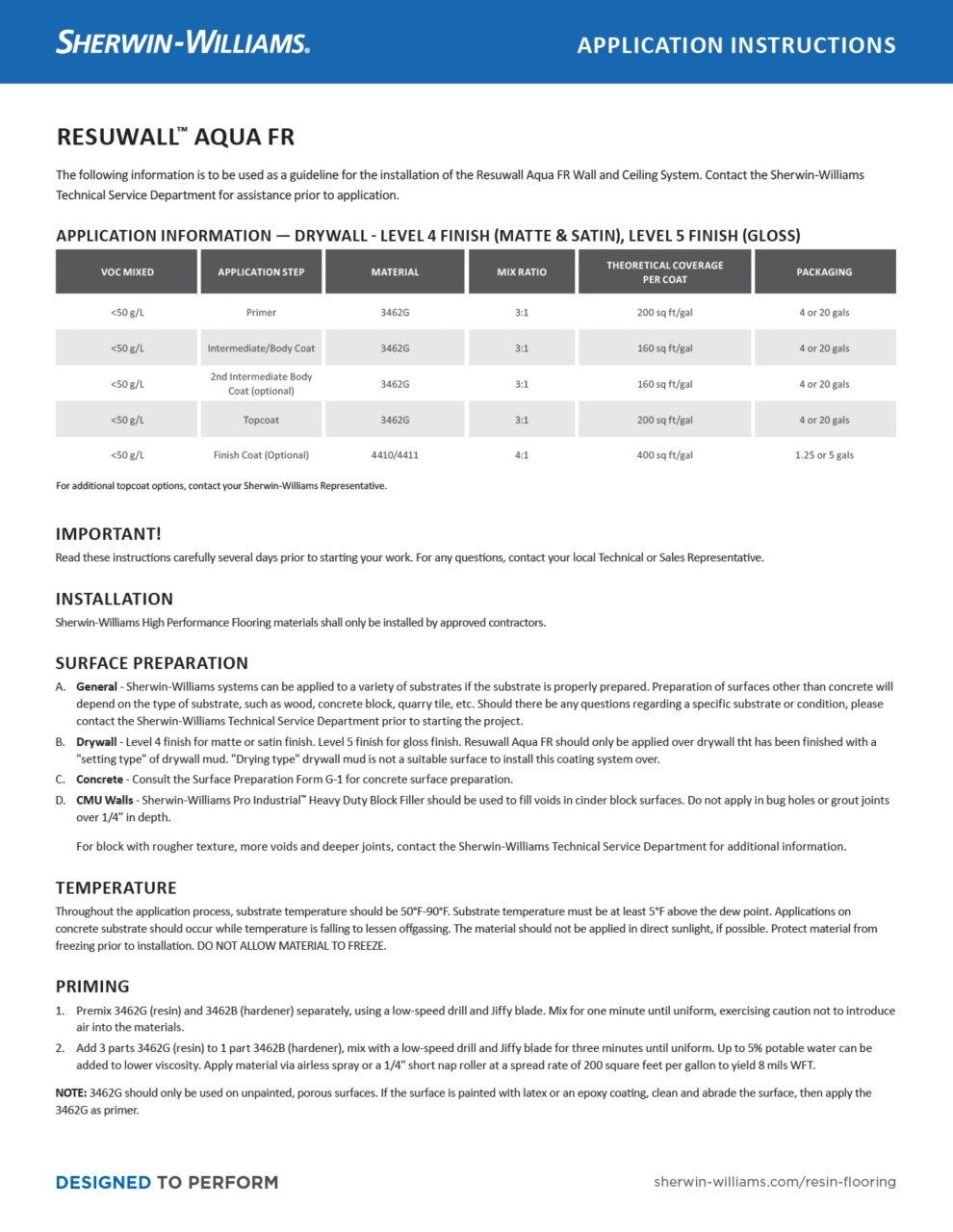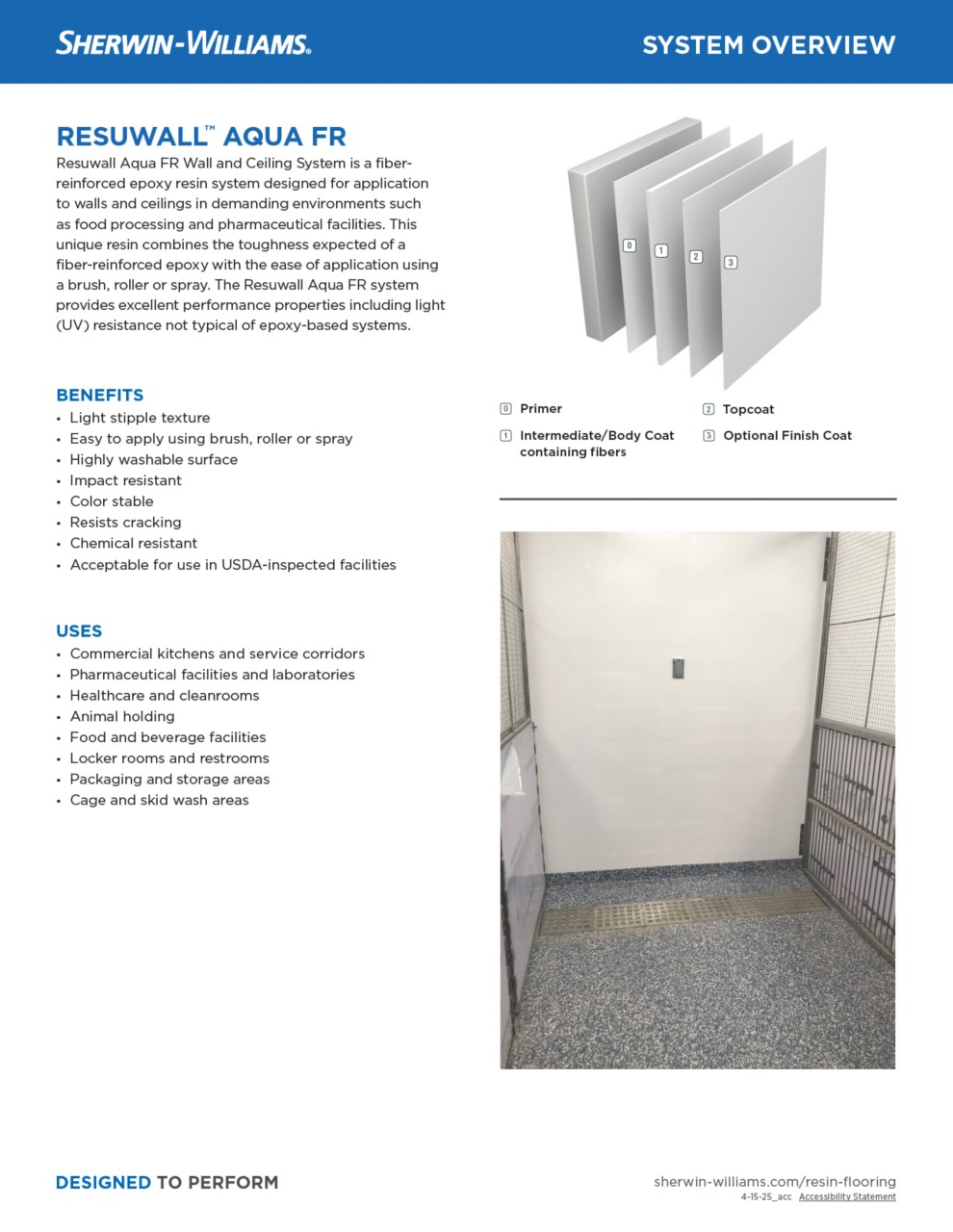 Resuwall™ Aqua FR is a fiber-reinforced epoxy resin system designed for application to walls and ceilings in demanding environments such as food processing and pharmaceutical facilities. This unique resin combines the toughness expected of a fiber-reinforced epoxy with the ease of application using a brush, roller or spray. Resuwall™ Aqua FR provides excellent performance properties including light (UV) resistance not typical of epoxy-based systems.