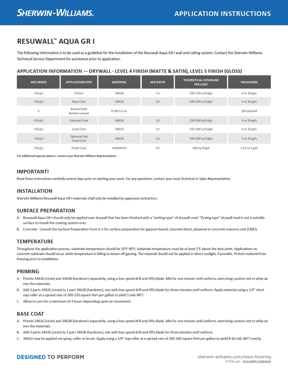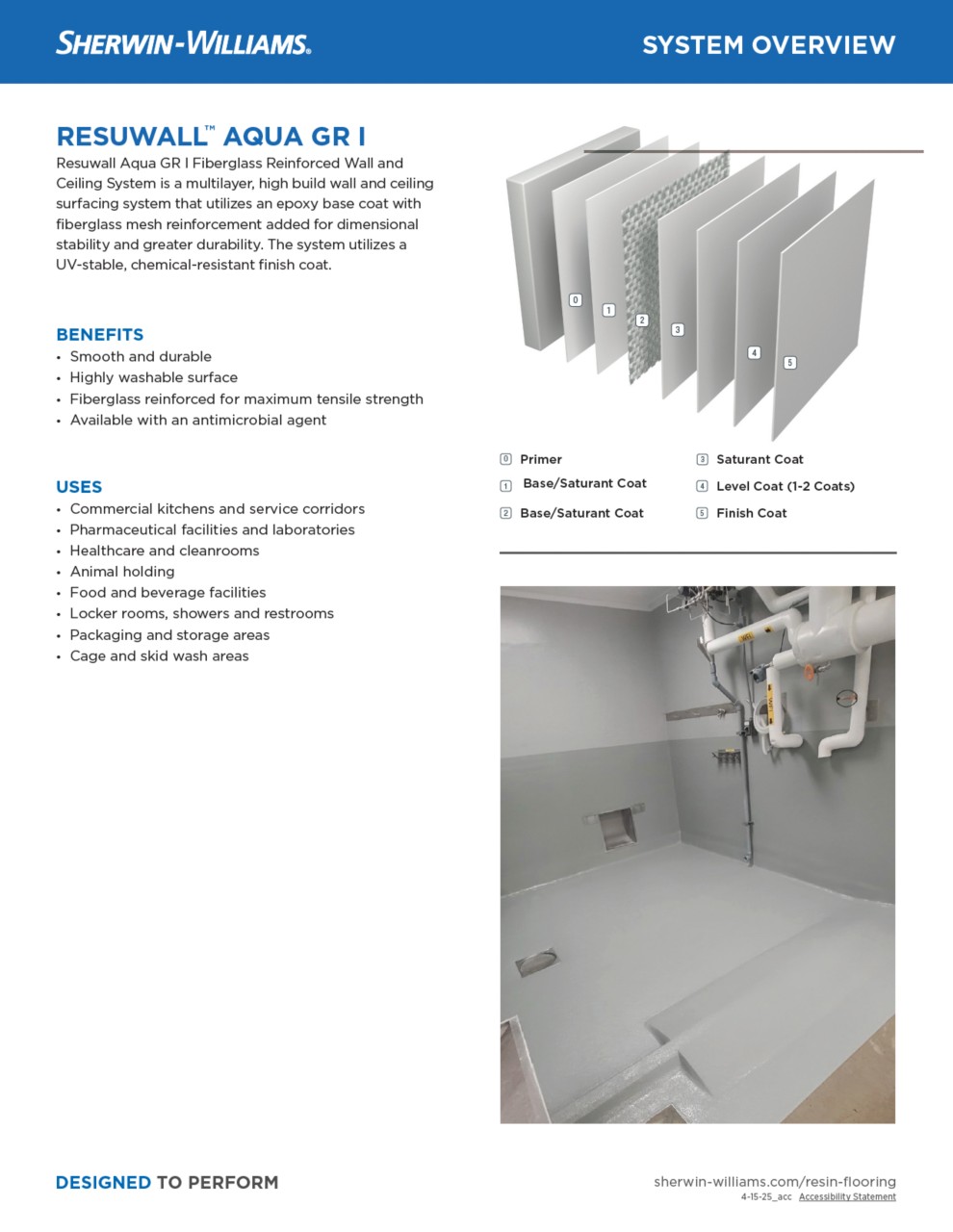 Resuwall Aqua GR I is a multi-layer, high build wall and ceiling surfacing system utilizing an epoxy base coat with fiberglass mesh reinforcement added for dimensional stability and greater durability. The system utilizes a UV stable, chemical resistant finish coat.