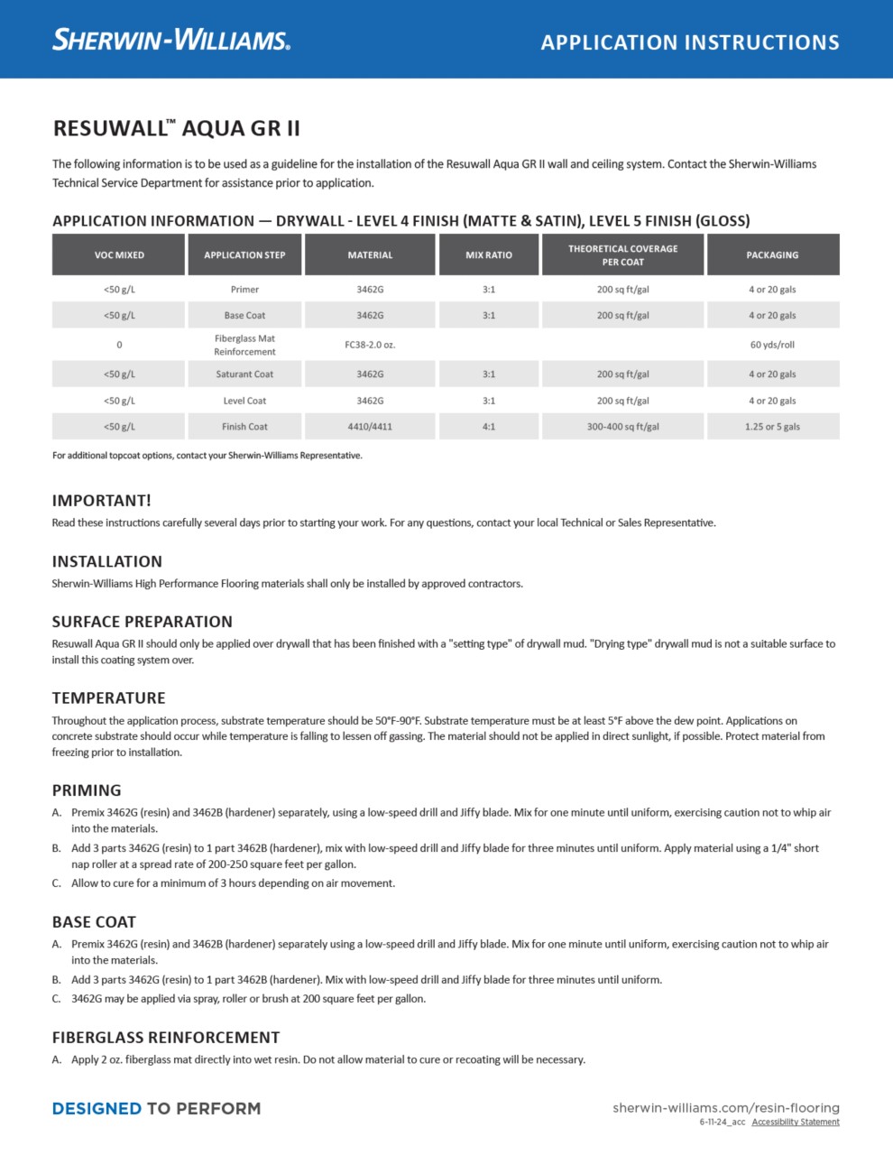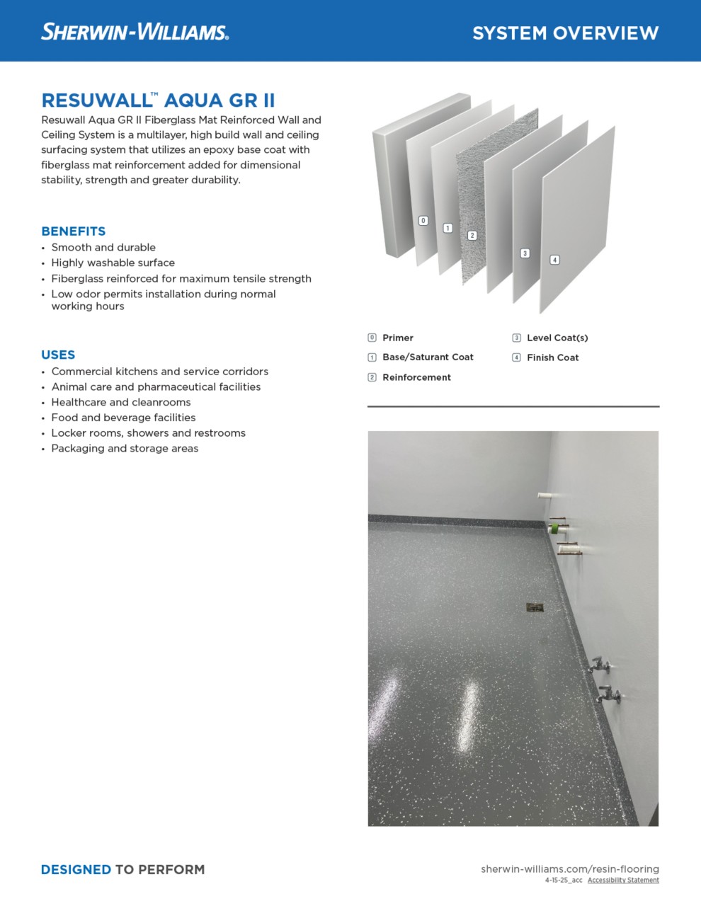 Resuwall Aqua GR II is a multi-layer, high build wall and ceiling surfacing systems utilizing an epoxy base coat with fiberglass mat reinforcement added for dimensional stability, strength, and greater durability. The system utilizes a UV stable, chemical resistant finish coat.
