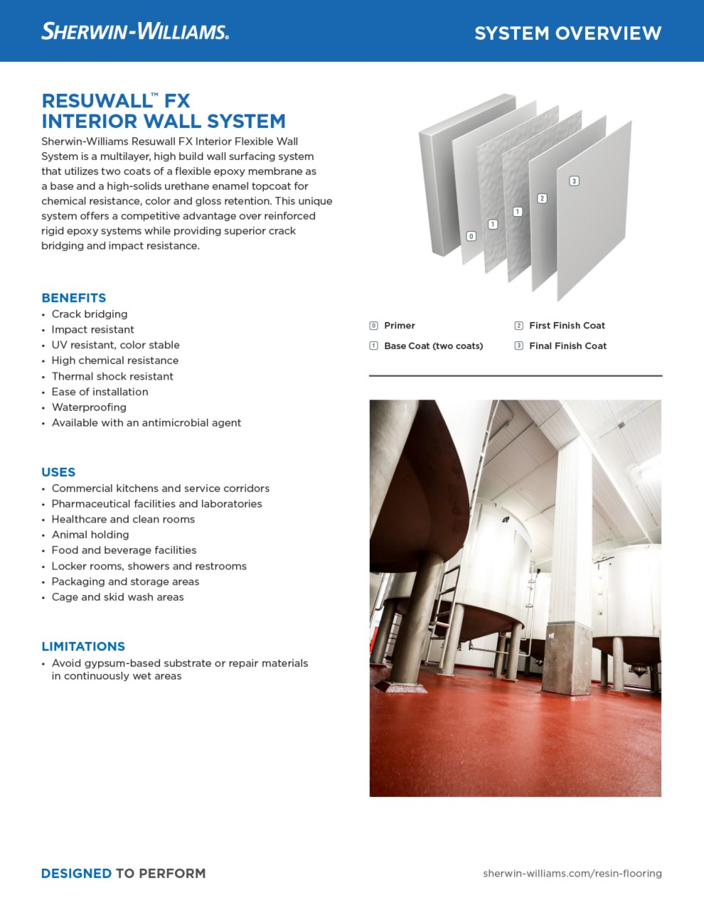 Resuwall™ FX is a multi-layer, high build wall surfacing system utilizing two coats of a flexible epoxy membrane as a base and a high solids urethane enamel topcoat for chemical resistance, color and gloss retention. This unique system offers a competitive advantage over reinforced rigid epoxy systems while providing superior crack bridging and impact resistance.