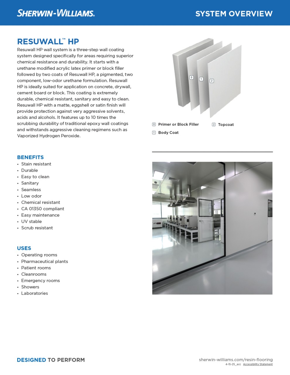 Resuwall™ HP is a three-step wall coating system designed specifically for areas requiring superior chemical resistance and durability. Resuwall™ HP consists of a urethane modified acrylic latex primer or block filler followed by two coats of Resutile™ HPW. It features up to 10 times the scrubbing durability of traditional epoxy wall coatings and withstands aggressive cleaning regimens such as Vaporized Hydrogen Peroxide.