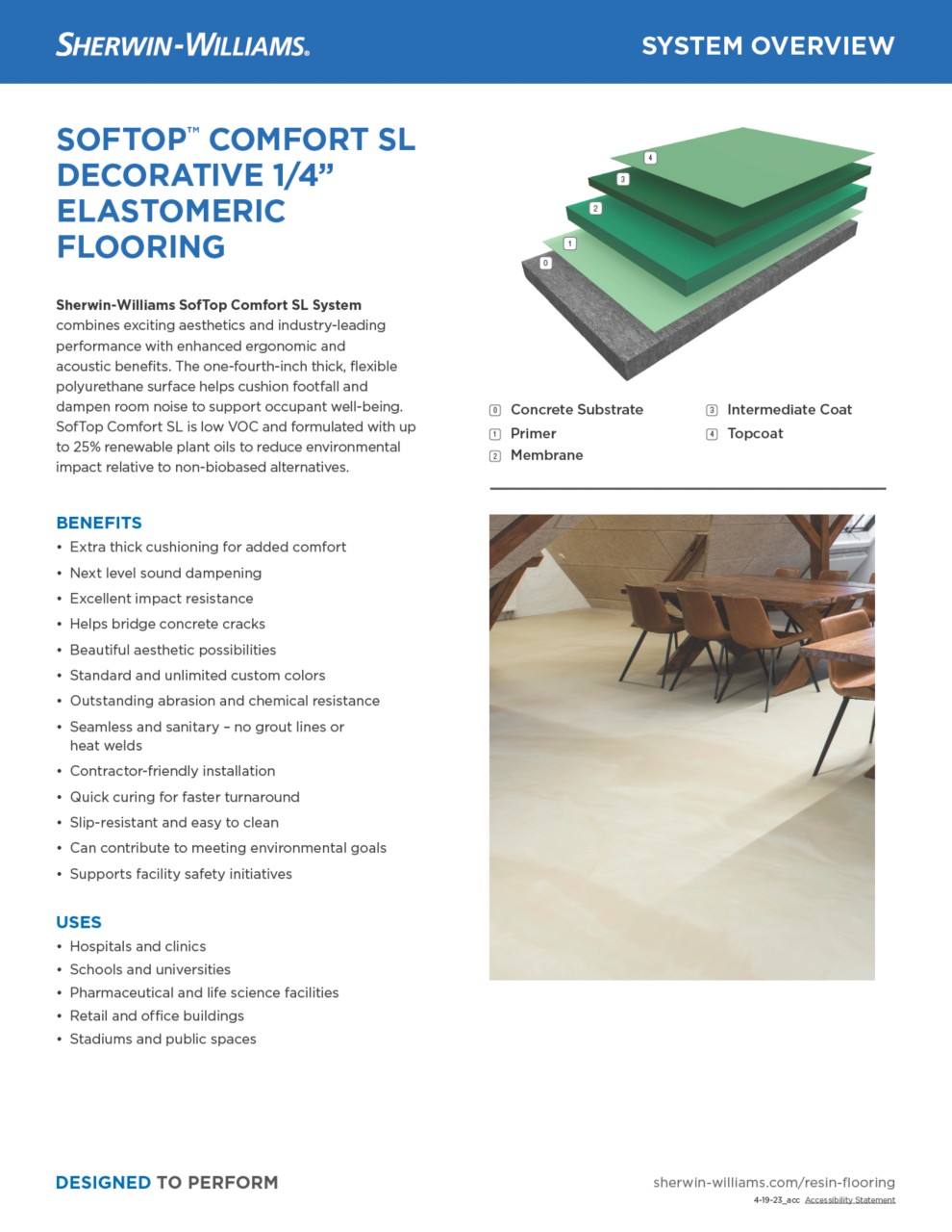 An innovative 1/4-inch thick, decorative elastomeric flooring system offering ergonomic and acoustic benefits.