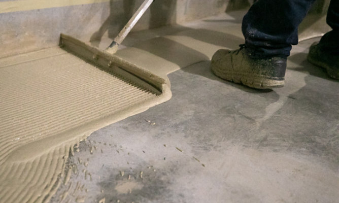 Installation began with detailed surface preparation, including shot blasting and grinding to achieve a concrete surface profile (CSP) of 3 to 4. After priming and thoroughly cleaning the substrate, crews applied the self-leveling SL45, using gauge rakes and trowels (Figure 2) to create uniform coverage and a lightly textured finish for slip resistance.